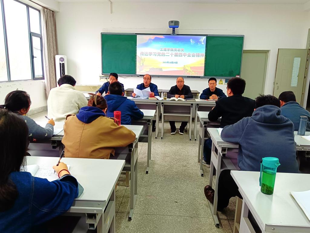 10月29日,土建学院党总支在四号实训楼202室组织召开会议,传达学习党的二十届四中全会精神。土建学院全体党员干部、教职工、在校班级班长和团支书参加会议,会议由党总支书记张凤文主持。